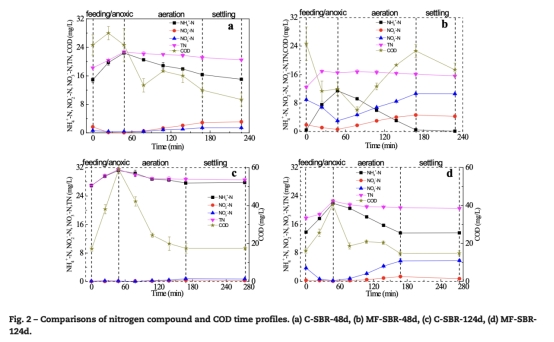2 運行周期內N2O和氮化合物變化數據:來自圖2和圖3,顯示N2O主要在沉降和排水期通過反硝化產生,好氧期與亞硝酸鹽積累相關。研究意義是揭示N2O產生時段和途徑,磁場通過促進亞硝酸鹽轉化和反硝化酶活性減少N2O積累,優化過程控制。
