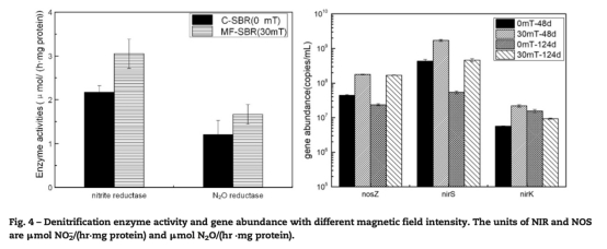 3 反硝化酶活性和基因豐度數據:來自圖4,MF-SBR的NIR和NOS活性分別提高40.5%和37.9%,nosZ、nirS和nirK基因豐度顯著增加。研究意義是表明磁場增強低溫下反硝化酶活性和基因表達,緩解低溫抑制,從而降低N2O排放并提高脫氮效率。