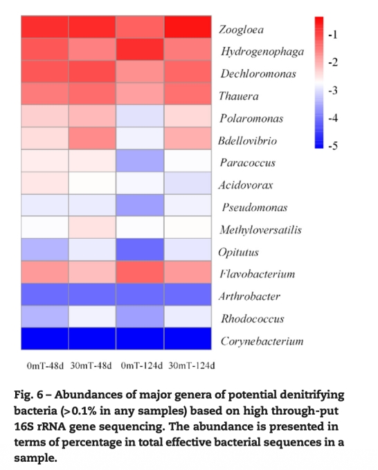 3 微生物群落分析顯示磁場促進AOB(Nitrosomonas)、NOB(Nitrospira)和反硝化菌(如Zoogloea)的豐度,優化菌群結構以實現高效脫氮和N2O減排。