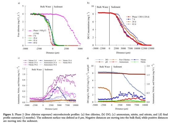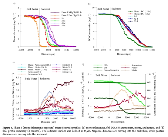 研究思路是使用Teflon杯反應(yīng)器填充2厘米深沉積物,連續(xù)暴露于4 mg L?1單氯胺或游離氯,流速5 mL min?1,分為三個(gè)階段:?jiǎn)温劝繁┞?個(gè)月(階段1)、游離氯暴露2個(gè)月(階段2)和再單氯胺暴露2個(gè)月(階段3)。使用微電極測(cè)量沉積物內(nèi)部從 bulk 流體到底部的單氯胺、游離氯、溶解氧、pH、銨、亞硝酸鹽和硝酸鹽的剖面。通過數(shù)學(xué)建模分析擴(kuò)散過程,并與測(cè)量數(shù)據(jù)比較,以理解化學(xué)傳輸和反應(yīng)。