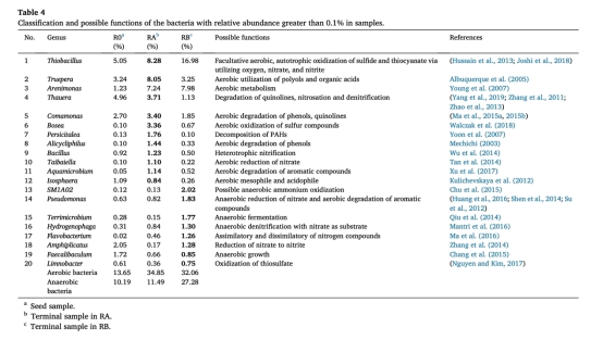 5 微生物群落數據:來自表3和表4,RB中好氧和厭氧細菌(如Thiobacillus、Pseudomonas)豐度增加,多樣性參數下降。研究意義是揭示微生物群落結構與功能分工的關聯,證實好氧-缺氧微環境促進了細菌共存,增強了污染物去除。