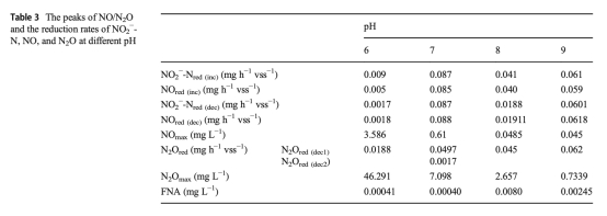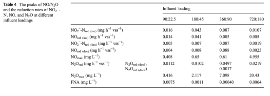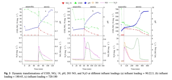 1 COD、NO2-N、pH、DO、NO和N2O的動(dòng)態(tài)變化數(shù)據(jù),來(lái)自圖1、圖2和圖3。研究意義:這些數(shù)據(jù)揭示了不同條件下NO和N2O的積累模式和速率,幫助識(shí)別關(guān)鍵影響因素如pH和負(fù)荷,為控制積累提供依據(jù)。