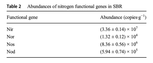3 功能基因豐度數(shù)據(jù),如Nir、Nor、Nos和Nod的絕對(duì)豐度,來(lái)自表2。研究意義:確認(rèn)NO歧化等生物路徑的存在,支持機(jī)制推測(cè),如高DO產(chǎn)生可能源于NO歧化。