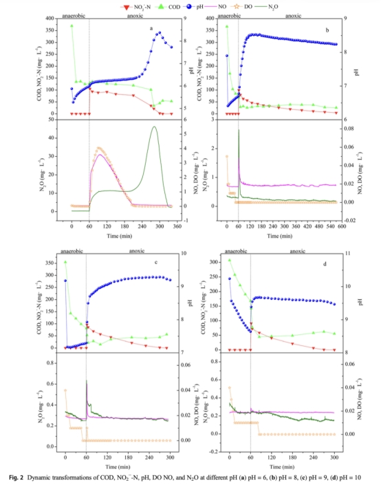 研究采用實(shí)驗(yàn)室規(guī)模SBR反應(yīng)器,培養(yǎng)反硝化污泥,進(jìn)行一系列批次測(cè)試。實(shí)驗(yàn)分為三部分:測(cè)試不同COD/N(1、4、6)對(duì)積累的影響;測(cè)試不同初始pH(6、7、8、9、10)的影響;測(cè)試不同進(jìn)水負(fù)荷(如90:22.5、180:45、360:90、720:180,COD:NO2-N)的影響。通過(guò)實(shí)時(shí)監(jiān)測(cè)參數(shù)如COD、NO2-N、pH、DO、NO和N2O,并結(jié)合功能基因定量分析,探討積累機(jī)制。