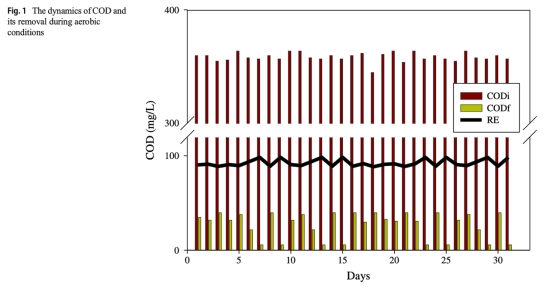 1 COD去除數據:來自圖1(好氧)和圖4(厭氧),顯示好氧條件下COD去除率高達90%,厭氧條件下為68-80%。研究意義是確認好氧處理更高效于碳去除,厭氧處理中COD貢獻于甲烷生成,為優化碳去除策略提供依據。