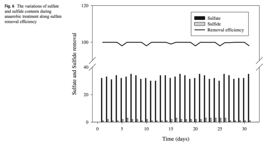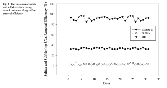 3 硫去除數據:來自圖3(好氧)和圖6(厭氧),顯示好氧條件下硫酸鹽去除率為85-97%,厭氧條件下近100%。研究意義是表明好氧條件下硫酸鹽轉化為元素硫,厭氧條件下硫化氫生成較少,指導硫回收和減少污染。