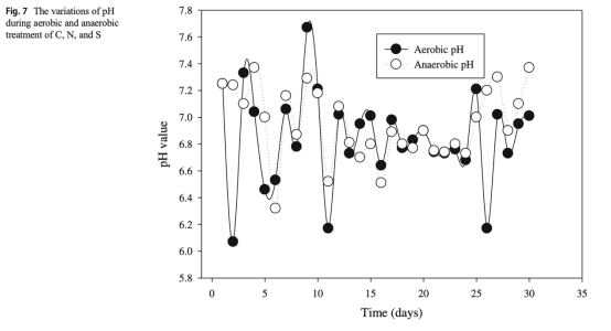 4 pH變化數據:來自圖7,顯示好氧和厭氧過程中的pH波動,好氧最適pH低于7,厭氧對pH更敏感。研究意義是強調pH作為關鍵因素影響微生物活性和產物形成,需在操作中控制pH以優化處理。