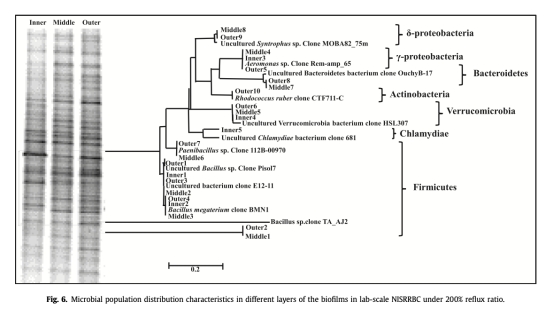4 微生物群落分布數(shù)據(jù),來(lái)自Fig.6。研究意義:外層生物膜以γ-變形菌、疣微菌和厚壁菌為主,多樣性高;內(nèi)層以厭氧菌為主,多樣性低。回流使功能菌群(如硝化菌和反硝化菌)空間分層優(yōu)化,支持高效污染物降解。