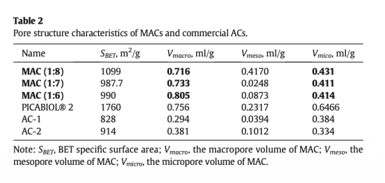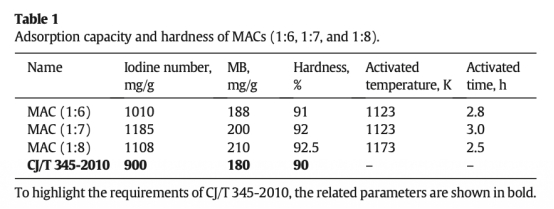 1 MAC的吸附性能和硬度數(shù)據(jù),如碘值、亞甲基藍(lán)吸附值、球盤硬度,來自Table 1。研究意義在于確保MAC滿足飲用水處理AC的選擇指南(CJ/T 345-2010)要求,保證其在實(shí)際應(yīng)用中的機(jī)械強(qiáng)度和吸附能力。