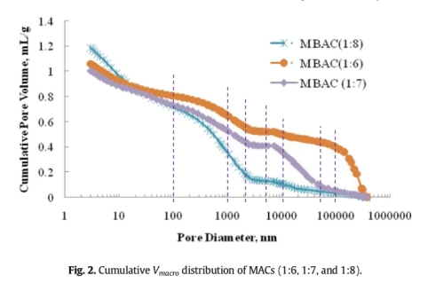 1 成功以竹廢料為原料,通過綠色工藝制備出MAC(1:6)。它同時(shí)具備發(fā)達(dá)的大孔體積(Vmacro=0.805 ml/g)和微孔體積(Vmicro=0.414 ml/g),以及高硬度(91%),完全滿足飲用水處理標(biāo)準(zhǔn)。