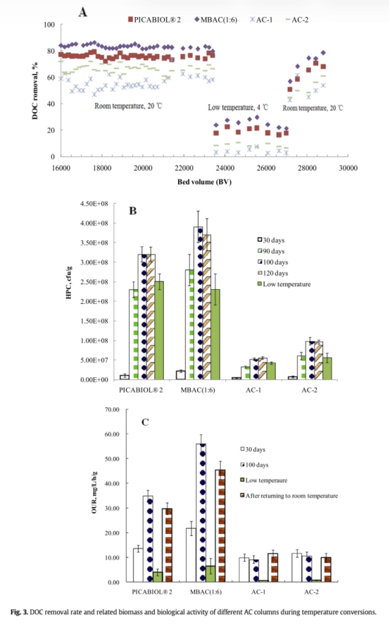 3 BAC柱運(yùn)行期間的DOC去除率數(shù)據(jù),來自Fig. 3A。研究意義在于直接證明MAC(1:6)在室溫和低溫下均具有最高的污染物去除效率,解決了低溫效率下降的難題。