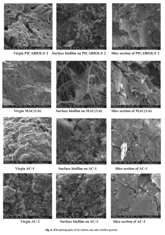 5 SEM顯微照片,來自Fig. 4。研究意義在于直觀證實(shí)微生物在MAC的大孔內(nèi)成功定殖和繁殖,為其優(yōu)越性能提供了視覺證據(jù)。