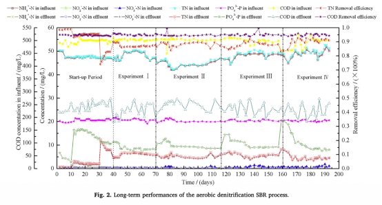1 長(zhǎng)期性能數(shù)據(jù),包括COD、NH4+-N、NO3--N、NO2--N、PO43--P和TN的出水濃度及去除效率,來(lái)自Fig. 2和Table 4。研究意義在于驗(yàn)證好氧反硝化過(guò)程在較高碳氮比(10)下能實(shí)現(xiàn)高效總氮去除(86.11%-90.05%),表明過(guò)量碳源可刺激電子傳遞鏈,提升脫氮效率。