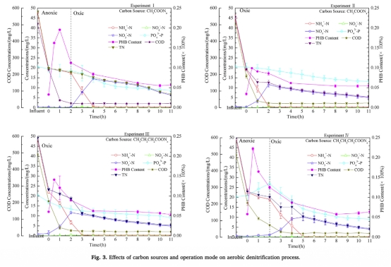 2 典型周期變化數(shù)據(jù),包括COD、氮磷污染物濃度和PHB含量的動(dòng)態(tài)變化,來(lái)自Fig. 3。研究意義在于揭示操作模式對(duì)PHB合成的關(guān)鍵作用,缺氧/好氧模式比完全好氧模式更利于PHB積累(最高達(dá)22.23%),而PHB含量與總氮去除效率呈正相關(guān),說(shuō)明PHB作為碳源存儲(chǔ)對(duì)好氧反硝化至關(guān)重要。