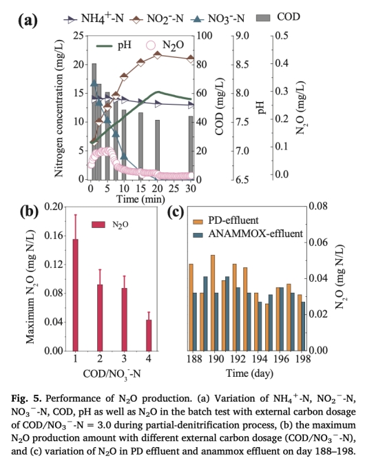 4 N2O產(chǎn)生數(shù)據(jù),來自Fig. 5,使用丹麥Unisense電極測量。研究意義在于量化過程的環(huán)境影響,顯示N2O產(chǎn)生量低(PD出水中0.031-0.053 mg/L),表明該工藝溫室氣體排放少,優(yōu)于傳統(tǒng)反硝化。