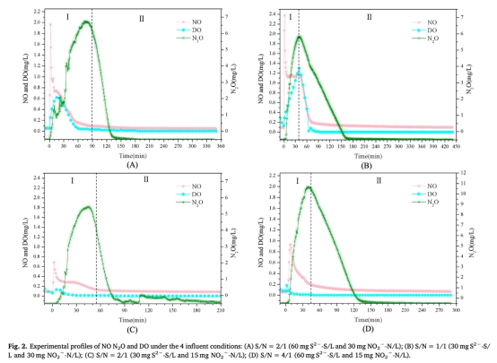 1 NO和N2O濃度數據,來自Fig. 2。研究意義在于直接量化溫室氣體排放水平,揭示積累動態和峰值特征,表明高亞硝酸鹽和低S/N比促進積累,為過程優化提供依據。
