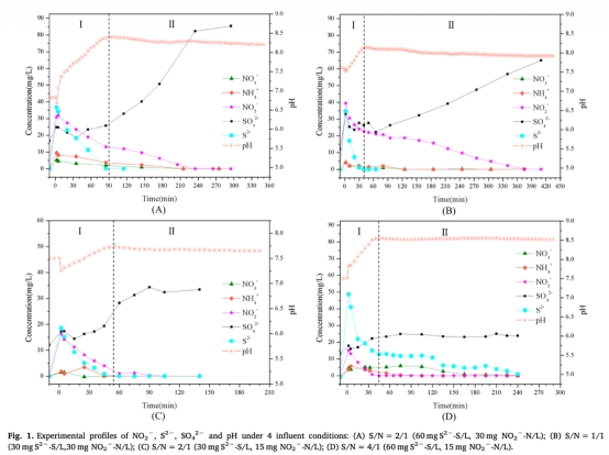 研究采用實驗室規模的序批式生物膜反應器,進行一系列批式試驗,設置四種不同進水條件(變化硫化物和亞硝酸鹽濃度)。通過脈沖投加方式引入底物,在線監測NO、N2O、DO、pH等參數,并分析硫化物、硫酸鹽濃度變化。同時,使用高通量測序分析微生物群落結構,以全面理解SOAD過程中的生物地球化學行為。