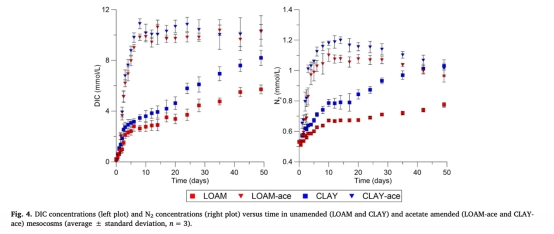 2 N?和DIC產量數據,來自Fig.4。研究意義:乙酸鹽添加組N?和DIC產量顯著高于對照組,粉砂黏土(CLAY)因本底有機質較高而表現更優,證實反硝化與碳源有效性直接相關,為優化碳氮比管理提供依據。