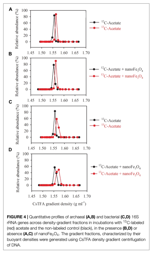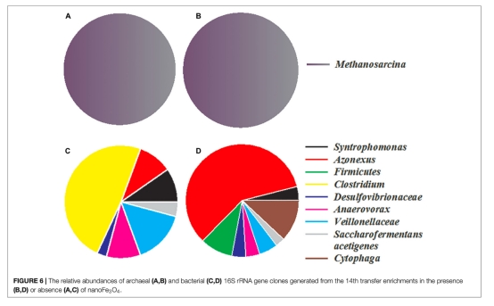 3 微生物群落分析數(shù)據(jù):來自Figure 4、Figure 5和Figure 6。通過DNA-SIP和T-RFLP分析,顯示甲烷八疊球菌(Methanosarcina)是主要的產(chǎn)甲烷菌,且納米Fe3O4處理下Azonexus等細菌相對豐度變化。研究意義在于表明納米Fe3O4促進了特定功能微生物的富集,可能與電子傳遞相關(guān)。