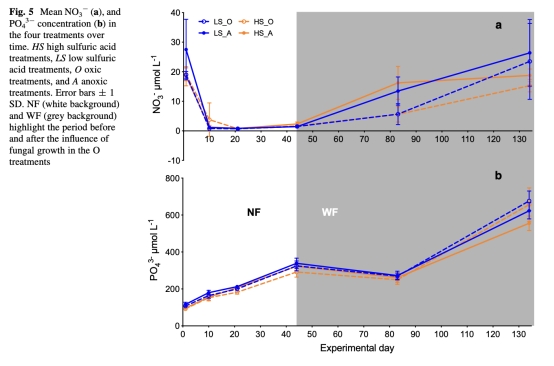研究意義:分析競爭電子受體的角色,NO3-消耗后鐵增加,表明電子受體可用性影響鐵還原;PO43-增加可能與鐵還原釋放有關。數據來自Fig. 5。