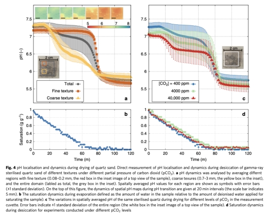 4. 空間分辨pH測量數(shù)據(jù):實驗室使用平面光極和Unisense微電極測量 sterilised quartz sand 在干燥過程中的pH變化,顯示pH降低和空間異質(zhì)性(Fig. 3, Fig. 4)。研究意義在于直接驗證模型預測,證實干燥過程中pH局部化的發(fā)生,支持微觀過程主導氣體排放的假設。