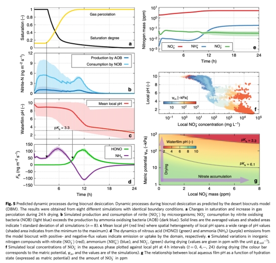 6. 微生物活動和化學物質(zhì)數(shù)據(jù):模型預測硝化菌活動、NO3積累和局部pH變化(Fig. 5e, f, g)。研究意義在于闡明微生物過程通過NO3積累驅(qū)動局部酸化,從而促進HONO排放。