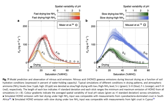 5. HONO和NH3排放預測數(shù)據(jù):模型模擬干燥生物結(jié)皮的排放動態(tài),顯示HONO和NH3排放峰值在特定水含量處出現(xiàn),并受干燥速率和大氣NH3水平影響(Fig. 5, Fig. 6, Fig. 7)。研究意義在于量化環(huán)境條件對排放的影響,為減排策略提供理論依據(jù)。
