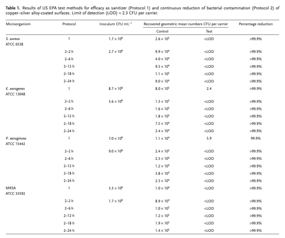 1. 銅銀合金涂層在模擬干燥表面生物膜形成的條件下,表現出強大的抗菌效力,符合美國EPA標準,能在24小時內持續減少多種細菌污染≥99.9%。