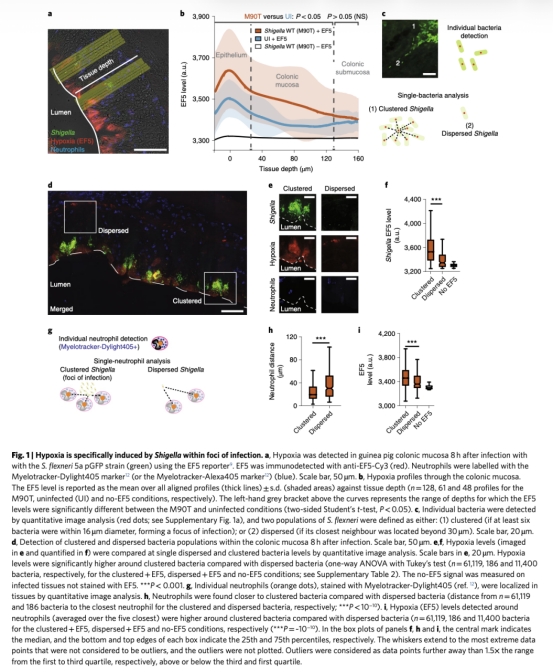 1. 組織缺氧水平:使用缺氧報告分子EF5免疫檢測,測量感染組織中不同深度(從上皮表面到黏膜下層)的缺氧程度,以及圍繞單個聚集菌和分散菌的局部缺氧水平。意義在于直接證明了福氏志賀氏菌感染會在黏膜層形成特定的缺氧灶,且缺氧與細菌的聚集狀態密切相關。數據主要來自圖1a, b, d, e, f。