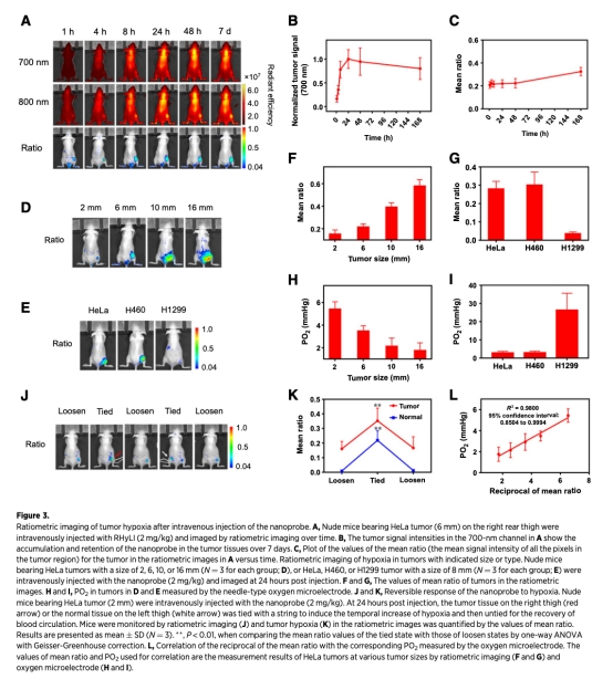 3. 缺氧成像與氧電極的相關(guān)性:比率成像的均值比率(mean ratio)與Unisense電極測量的PO2呈線性相關(guān)( reciprocal of mean ratio vs. PO2),例如在HeLa腫瘤中,PO2范圍1-27 mmHg對應(yīng)比率變化(圖3L)。意義在于提供定量校準,將成像信號轉(zhuǎn)化為實際氧分壓,增強數(shù)據(jù)的可靠性和臨床轉(zhuǎn)化潛力。數(shù)據(jù)來自圖3L。
