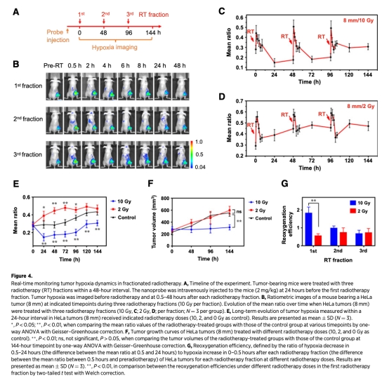 這篇論文摘要闡述了缺氧在腫瘤對放療抵抗中的關(guān)鍵作用,研究放療期間缺氧動態(tài)對改善治療計劃和預(yù)后很重要。作者開發(fā)了一種發(fā)光納米探針(RHyLI),由熒光半導(dǎo)體聚合物和鈀復(fù)合物組成,能在狹窄氧范圍(0-30 mmHg O2)內(nèi)對缺氧細微變化提供高靈敏度和可逆響應(yīng)。靜脈注射后,探針有效積累并分布在腫瘤中,包括缺氧區(qū)域。通過700和800 nm發(fā)射比率進行定量成像,用于分次放療期間7天內(nèi)的腫瘤缺氧動態(tài)成像。結(jié)果顯示,高分次劑量(10 Gy)比低劑量(2 Gy)更有效改善腫瘤再氧合,且效果在較小或更放射敏感腫瘤中持續(xù)更久。第一次分次的再氧合效率對預(yù)測放療結(jié)果很重要。