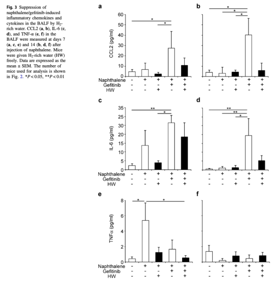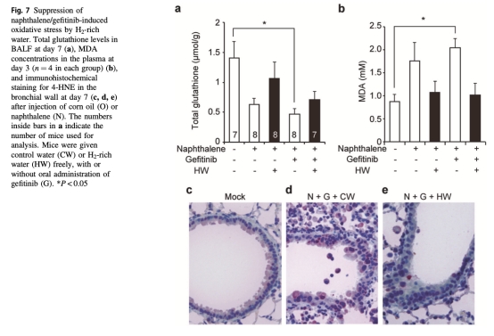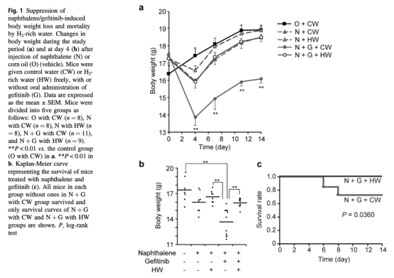 這篇論文摘要闡述了盡管EGFR酪氨酸激酶抑制劑吉非替尼對晚期非小細胞肺癌高度有效,但可能引發嚴重急性間質性肺炎。分子氫作為一種治療性和預防性抗氧化劑,能有效保護小鼠肺免受萘腹腔注射后口服吉非替尼引起的嚴重損傷。自由飲用富氫水減輕了萘/吉非替尼誘導的體重下降,顯著提高生存率,這與肺炎癥和支氣管肺泡灌洗液中炎癥細胞因子的減少相關。萘降低了肺中谷胱甘肽,增加了血漿中丙二醛,并增加了氣道細胞中4-羥基-2-壬烯醛的產生,所有這些都被富氫水緩解,表明富氫水逆轉了氧化應激引起的支氣管壁細胞損傷。最后,氫處理不干擾吉非替尼對體外肺癌細胞系或體內荷瘤小鼠的抗腫瘤作用。結果表明富氫水有潛力通過減輕肺損傷而不損害抗腫瘤活性來改善吉非替尼治療期間的生活質量。