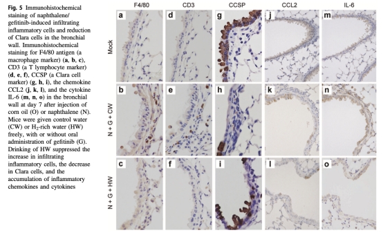 5. 免疫組化分析:萘/吉非替尼增加F4/80+巨噬細胞和CD3+ T細胞浸潤,減少CCSP+ Clara細胞,富氫水逆轉這些變化并降低CCL2和IL-6陽性細胞(圖5)。研究意義在于細胞水平顯示氫保護上皮干細胞和調節免疫細胞,強調其在組織修復中的作用。