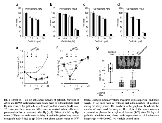 8. 抗腫瘤活性測試:體外和體內實驗顯示氫不影響吉非替尼誘導的肺癌細胞死亡或腫瘤縮?。▓D8)。研究意義在于確保氫的安全性,不妥協抗癌療效,促進其輔助治療應用。