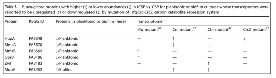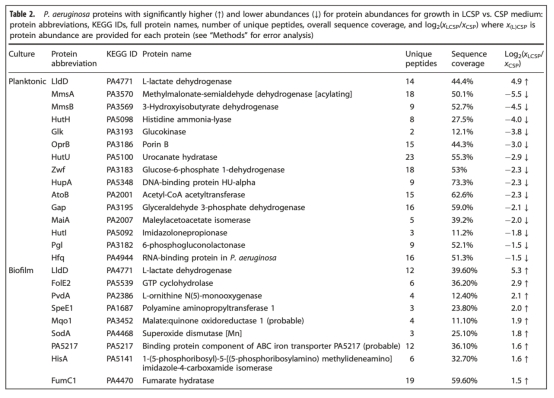 3. 蛋白質豐度數據:通過蛋白質組學測量了關鍵酶和調節蛋白的豐度變化,來自圖4、表2和表3。研究意義是揭示代謝途徑的分子基礎,如乳酸脫氫酶(LldD)在乳酸存在下高表達,而葡萄糖代謝相關蛋白被抑制,這支持反向雙峰的調控機制,并識別出與生物膜形成相關的新蛋白。