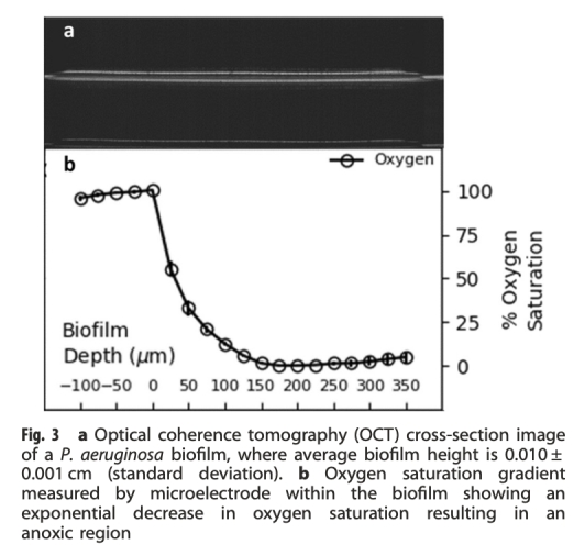 4. 氧氣濃度數據:使用丹麥Unisense電極測量生物膜內的氧氣梯度,來自圖3。研究意義是量化氧氣擴散限制,顯示生物膜頂部有氧而底部缺氧,這解釋了反向雙峰在低氧環境下的可行性,并強調終端電子受體(如氧氣)在代謝中的關鍵作用。