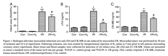 1 心肌梗死面積和心肌酶數(shù)據來自圖1。研究意義是直接評估心肌損傷程度,顯示氫能顯著減少梗死面積和降低cTnI、CK-MB水平,表明氫對心肌有保護作用。