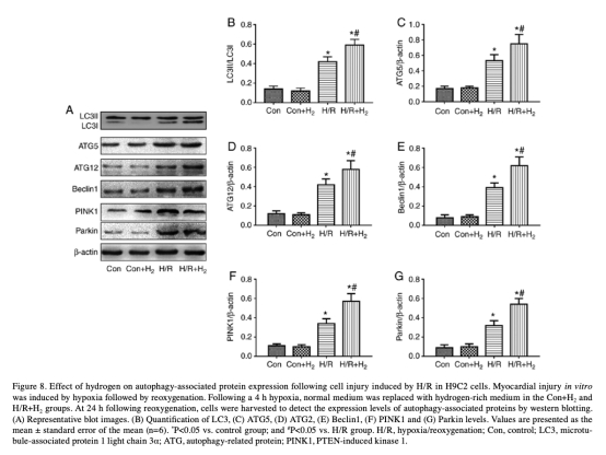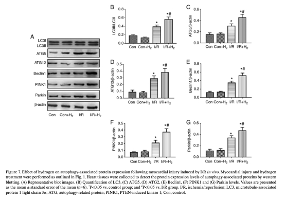 6 自噬相關蛋白表達數(shù)據來自圖7和圖8。研究意義是探索分子機制,氫上調LC3、ATG5、ATG12、Beclin1、PINK1和Parkin蛋白,表明氫激活自噬通路。