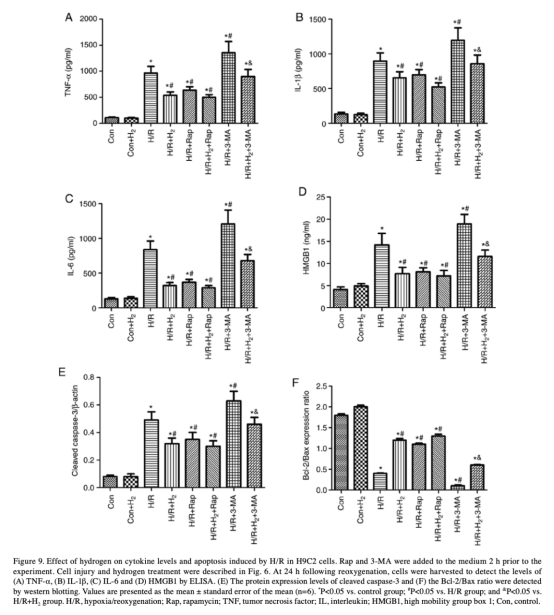7 自噬調節(jié)對細胞因子和凋亡的影響數(shù)據來自圖9。研究意義是驗證自噬的作用,使用rapamycin和3-MA顯示氫通過自噬抑制炎癥和凋亡。
