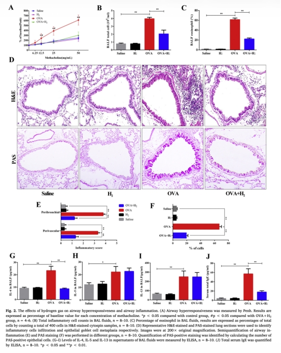 1 氣道高反應性數據來自圖2A,通過全身體積描記法測量Penh值。研究意義是顯示氫氣體吸入顯著降低OVA誘導的氣道高反應性,表明氫氣體改善了哮喘的氣道功能。
