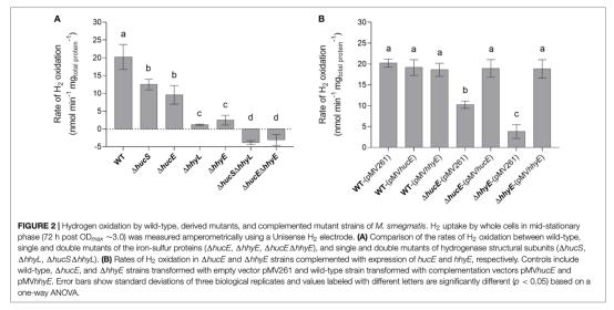 1 氫氣氧化速率數(shù)據(jù)來自圖2,使用丹麥Unisense H2微傳感器電極測量。研究意義是直接量化突變體對氫氣的消耗能力,顯示缺失HucE或HhyE顯著降低氧化速率,雙突變則完全消除活性,證實這些蛋白是氫氣氧化所必需的,并支持它們在電子傳遞中的核心作用。