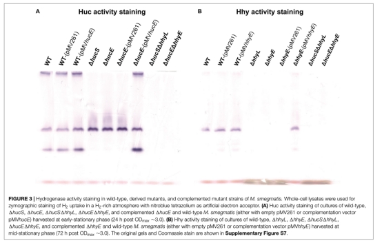 2 氫化酶活性染色數(shù)據(jù)來自圖3,通過 native PAGE 和 nitroblue tetrazolium 染色檢測。研究意義是可視化氫化酶活性,顯示缺失HucE或HhyE導(dǎo)致活性條帶消失,互補實驗恢復(fù)活性,驗證這些蛋白對氫化酶功能不可或缺,且與結(jié)構(gòu)亞基缺失表型一致。