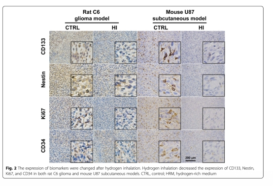 2 干細胞和增殖標志物表達數據來自圖2。研究意義是顯示氫下調CD133、Nestin、Ki67和CD34表達,表明氫能減弱腫瘤干性和增殖,抑制血管生成。