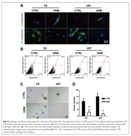 3 體外干性評估數據來自圖3,包括GFAP和CD133免疫熒光、CD133流式細胞術和球體形成實驗。研究意義是驗證氫通過上調GFAP和下調CD133誘導分化,并抑制自我更新能力,確認氫對GSC的直接作用。