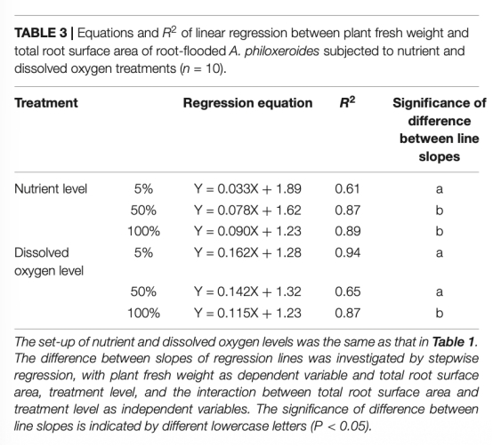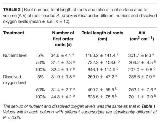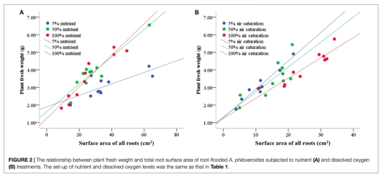 4. 根效率(植物鮮重與根表面積的關系):來自表3和圖2。研究意義:營養缺乏時根效率低,表明單位根表面積的營養吸收不足;溶解氧缺乏時根效率高,提示氧脅迫下根功能優化,可能與內部氧改善有關,為洪水耐受機制提供線索。