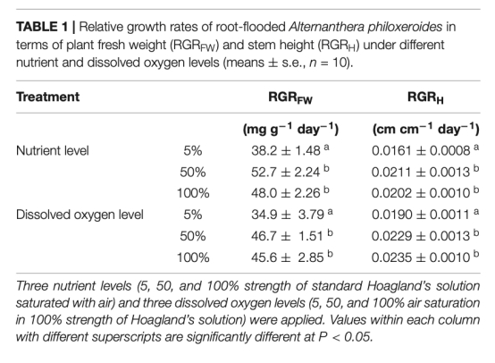 根淹水陸生植物空心蓮子草在營養與溶解氧脅迫下相似的生長性能但對比的生物量分配。