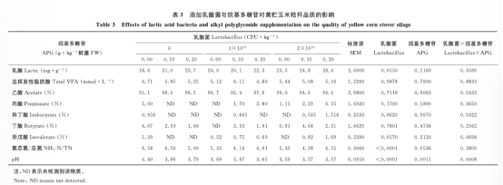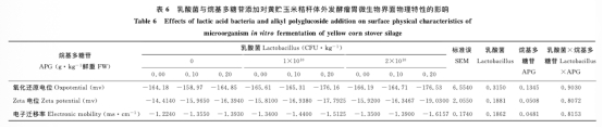 論文摘要指出,研究旨在探討乳酸菌和烷基多糖苷對玉米秸稈黃貯品質和體外發酵特性的影響。采用3x3雙因子實驗設計,乳酸菌設三個水平(0、1x10^10、2x10^10 CFU/kg),烷基多糖苷設三個水平(0、0.10、0.20 g/kg)。結果表明,乳酸菌添加增加乳酸含量、比表面積、外觀總分、酸性洗滌纖維和干物質含量,降低氨氮/總氮;體外發酵中潛在最大產氣量和總揮發性脂肪酸增加,產氣速率降低。烷基多糖苷提高外觀總分、酸性洗滌纖維、干物質含量、Zeta電位、電子遷移率和干物質消失率。乳酸菌與烷基多糖苷交互影響粗蛋白質、pH值、乙酸、異丁酸等。最佳添加量為乳酸菌2x10^10 CFU/kg和烷基多糖苷0.20 g/kg,能保證黃貯品質并提高降解特性。