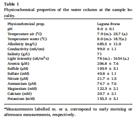 測量數據:水柱中硫化物濃度為 103.9 ± 3.1 μM,而微生物墊孔隙水中的濃度更高,介于 104 至 234 μM之間(Supplementary Table 4)。