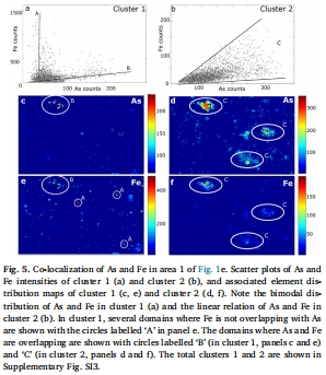 研究意義:定量化地證實了砷與鐵的相關性并非普遍存在,而是具有雙重模式:一部分砷與鐵熱點緊密相關(可能代表吸附在鐵礦物上),另一部分則呈現彌散的相關性(可能代表從降解的EPS中釋放出來),深化了對砷固-解過程的理解。