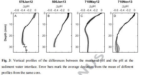 數(shù)據(jù):沉積物-水界面以下pH值的垂直分布(毫米分辨率)。